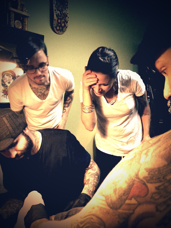 this past friday, yup the 13th, my husband, our friends, and i got together for a bit of a gift exchange. the gift being one terrible tattoo. each chose a name out of a hat, then laughs and good times followed. i sat out of the tattooing part and just took the photos...